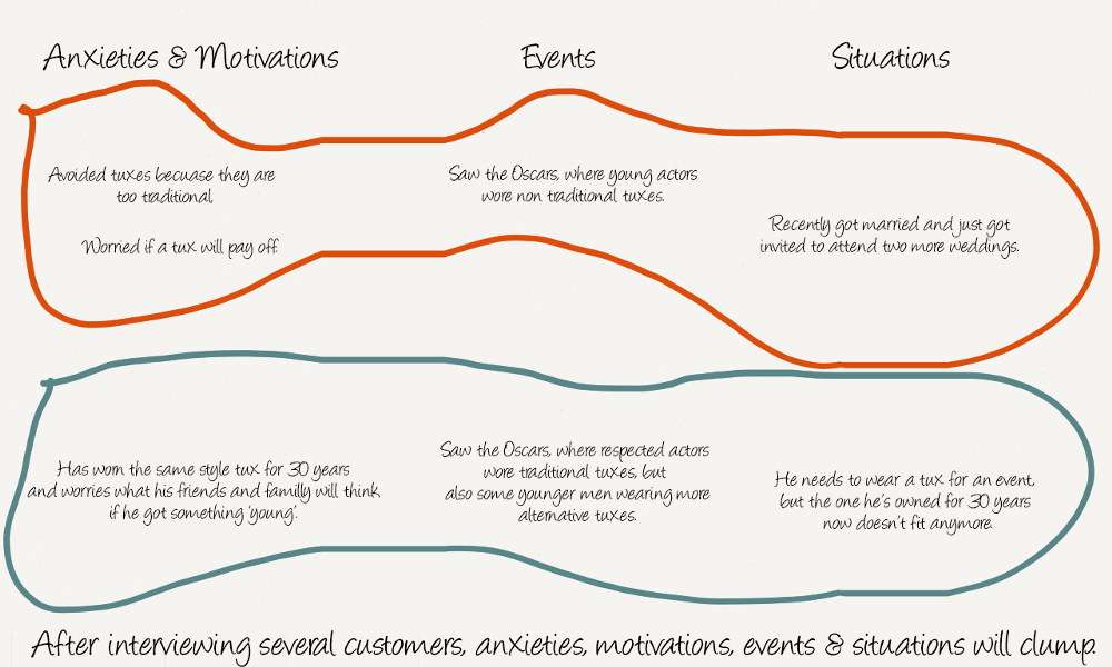 Customersā anxieties & motivations are discovered through interviewing them. How to uncover them is beyond the scope of this article. A good place to start would be to learn about the progress making forces diagram, this udemy course as well as some techniques explained by David Wu.