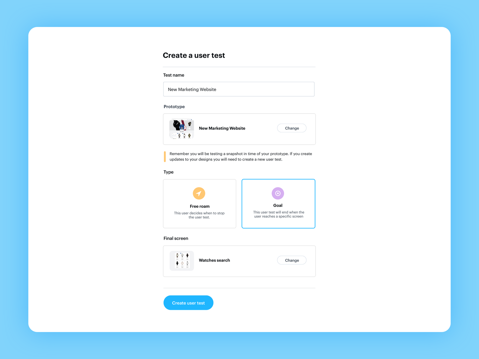 - After giving your test a name, select the desktop prototype, then choose the type of test from either free roam (the user can stop at any time) or goal based (the test ends when the user gets to a specific screen).