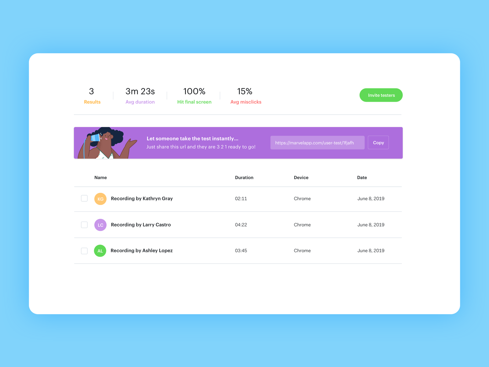 - Inviting someone to participate in a test only takes a few clicks. Share your unique URL via email, SMS, Slack or social media.