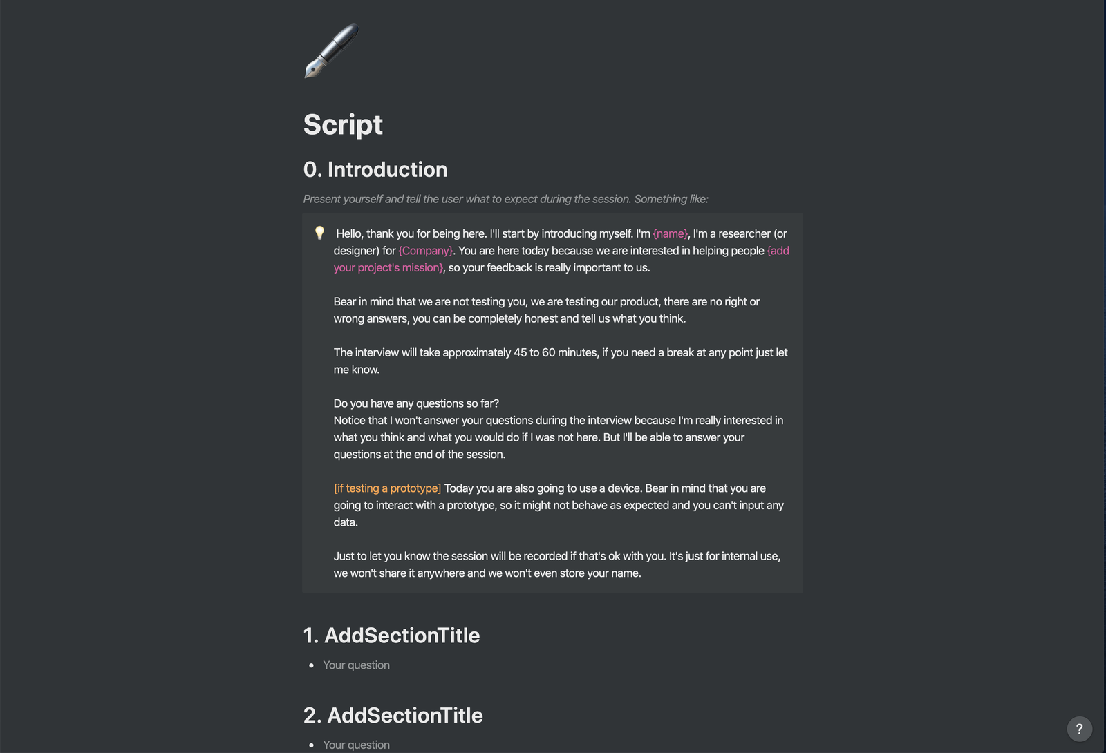 - At the end of the script, ask your note taker if they have any questions for your participant. You might have missed something or they might have something interesting to ask based on everything they heard and wrote down.