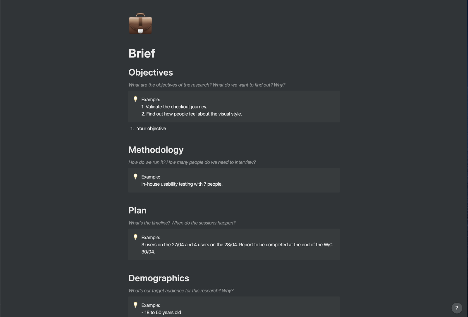 This is the core of your UX research project. On the left, you set it up by collecting the necessary information in the brief and writing the script(s). On the right, you gather your outputs. You have a collection of session notes and the research report to be filled. I also included a handy list of interesting articles that I found about
