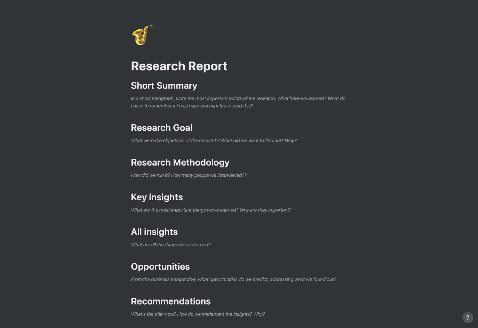 If you run the research project, this is the magic document that you are going to share with your organisation to communicate everything youâve discovered.