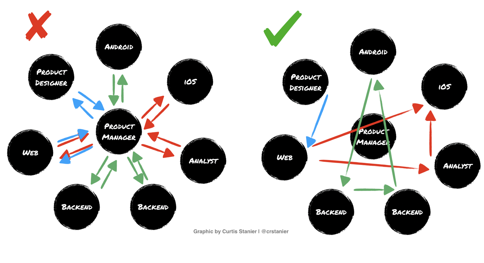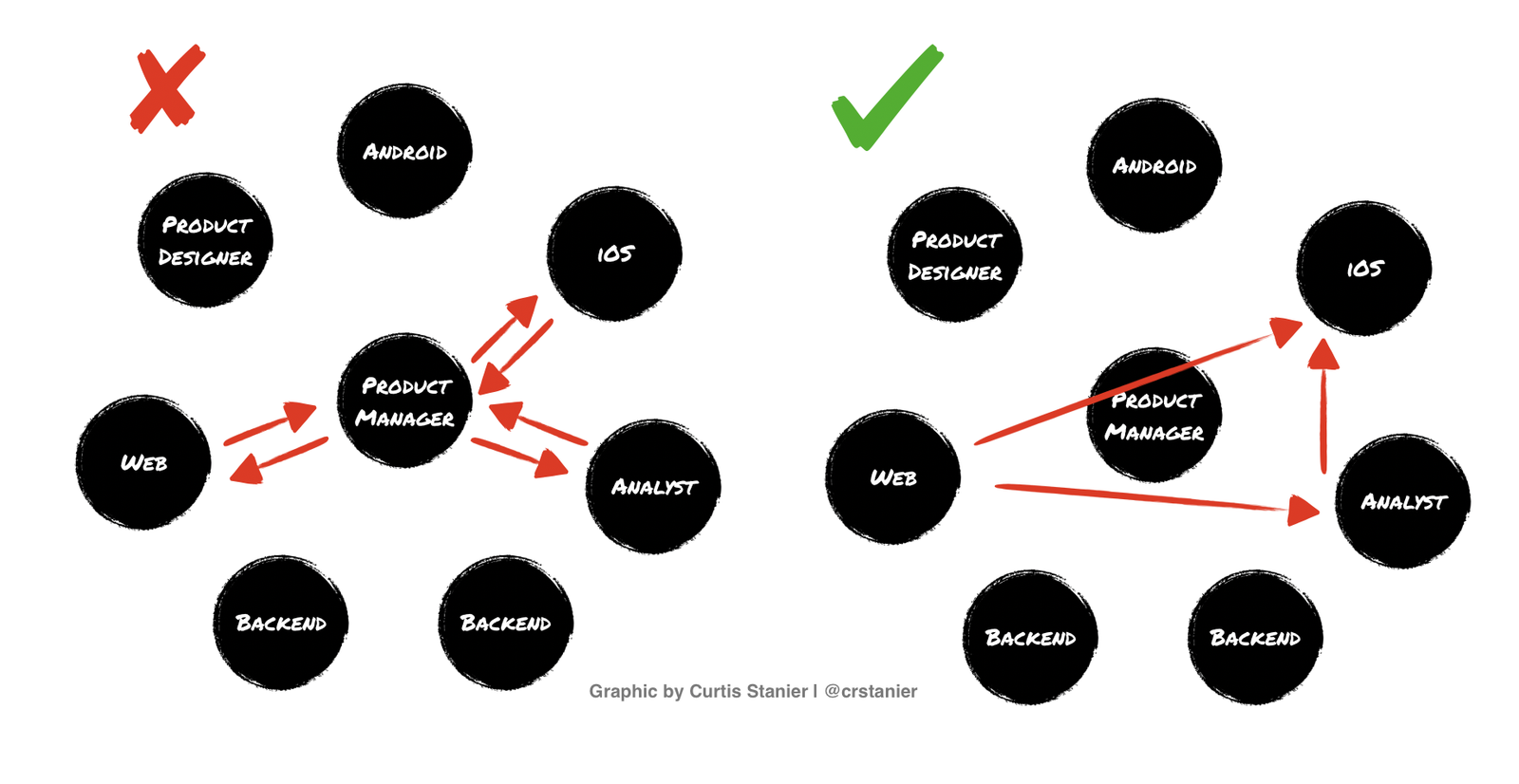 In comparison, in the example on the right, the Web Engineer directly approaches the Analyst who explains the situations. They then align with the iOS Developer. Note how many fewer interactions (red arrows) need to happen.