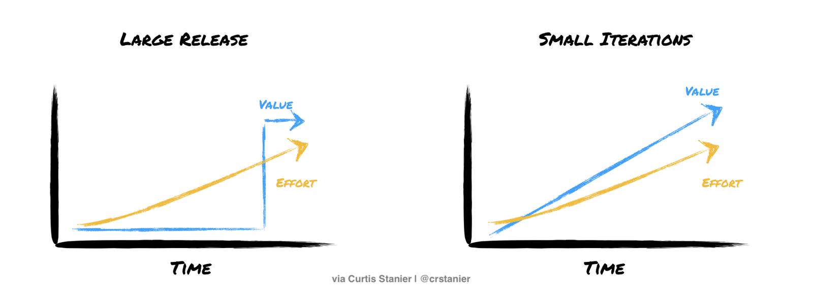 When teams ship after a large release, you hope to get an immediate hit of value. Even operating on the assumption that you release the perfect solution with no technical issues first time (spoiler alert: itâs unlikely). There has been a large investment made by your team (in terms of time) that has not returned anything (left diagram).
