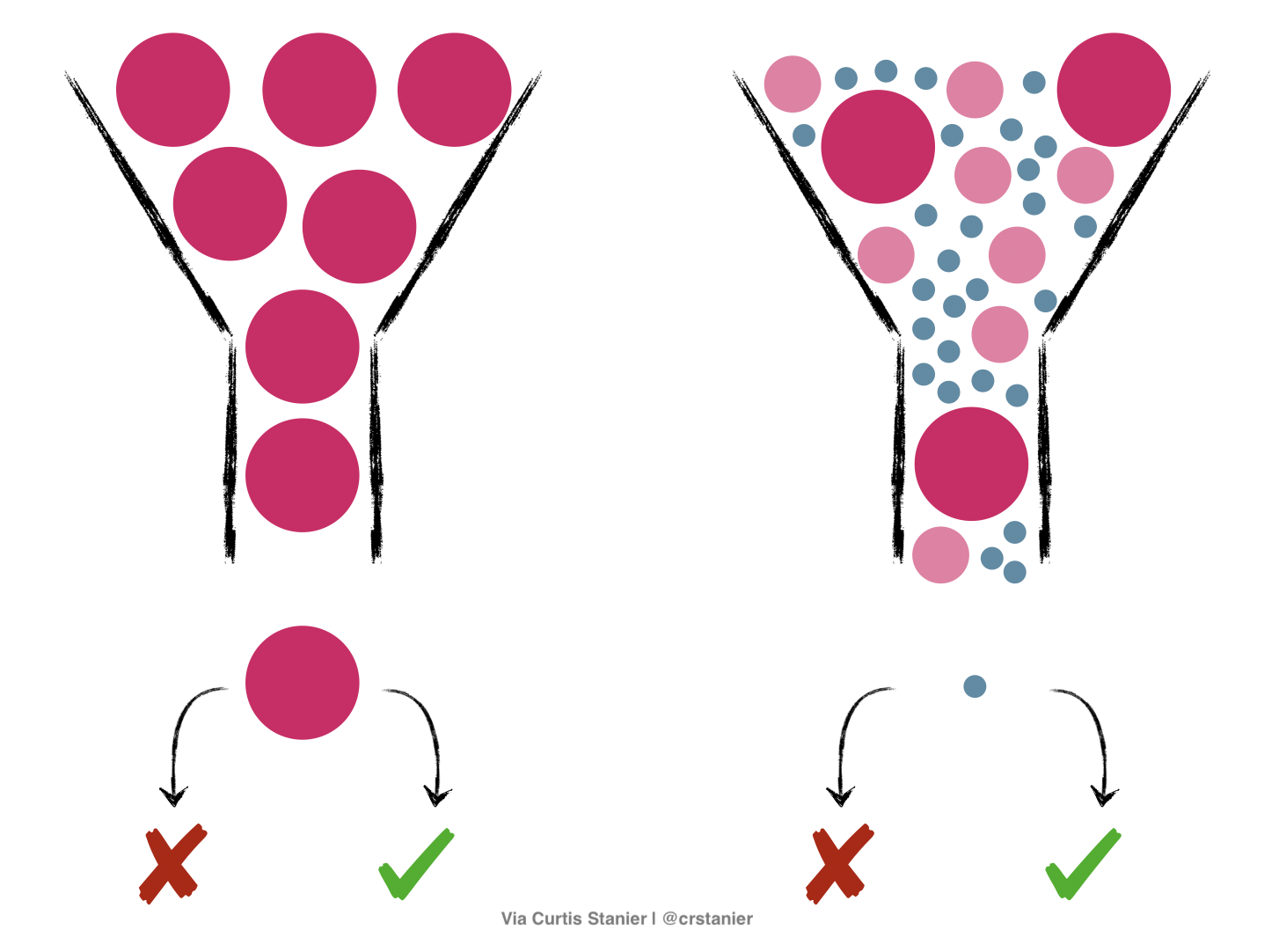 The problem is usually caused by only working on larger chunks of work (funnel on the left). As a result, a team can only work on one topic at a time. This approach may be acceptable if weâre certain something is the right thing to build, but this is very rarely the case. If something drops out the bottom of our pipeline and it doesnât work, you spent more effort than required in order to get to that learning.