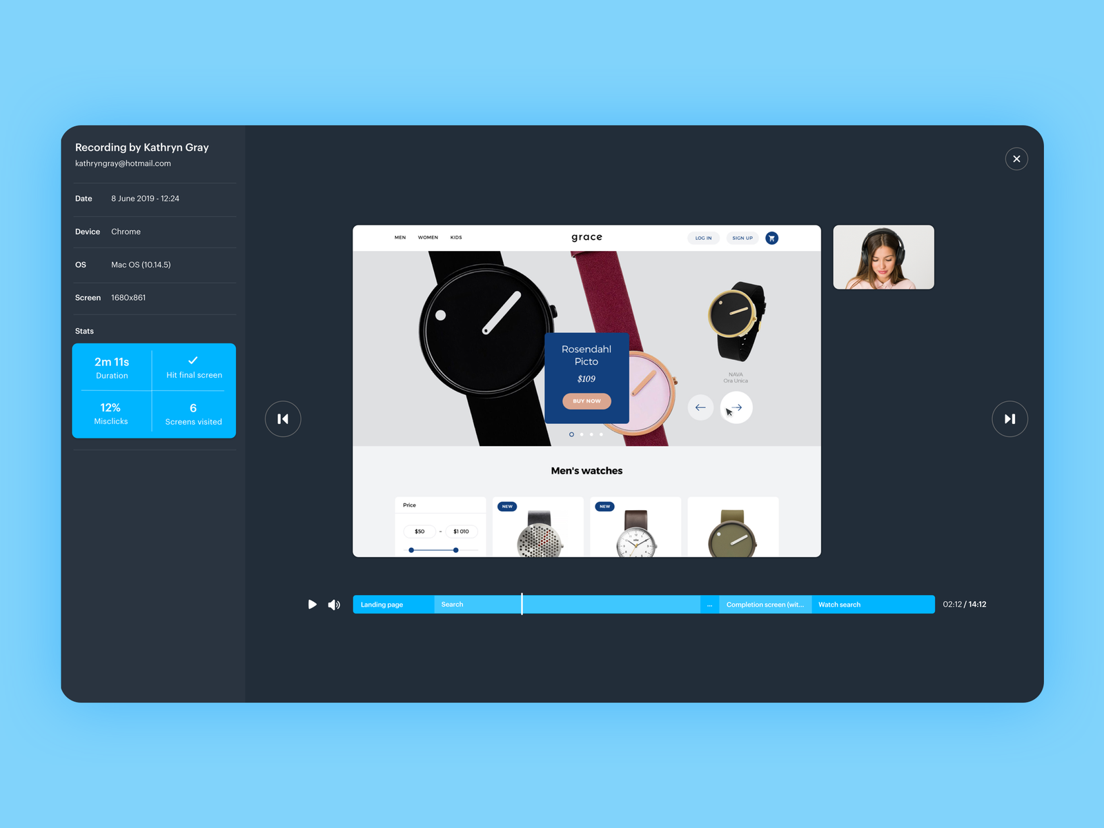 - Screen recording: The central part of your results will be the screen recording of test. This allows you to see the entire journey including every click, tap and swipe on your prototype, highlighting problems they’ve had along the way. We even show each screen in your prototype as a timestamped segment on the video progress bar so you can quickly navigate to the parts of the session you’re most interested in.
